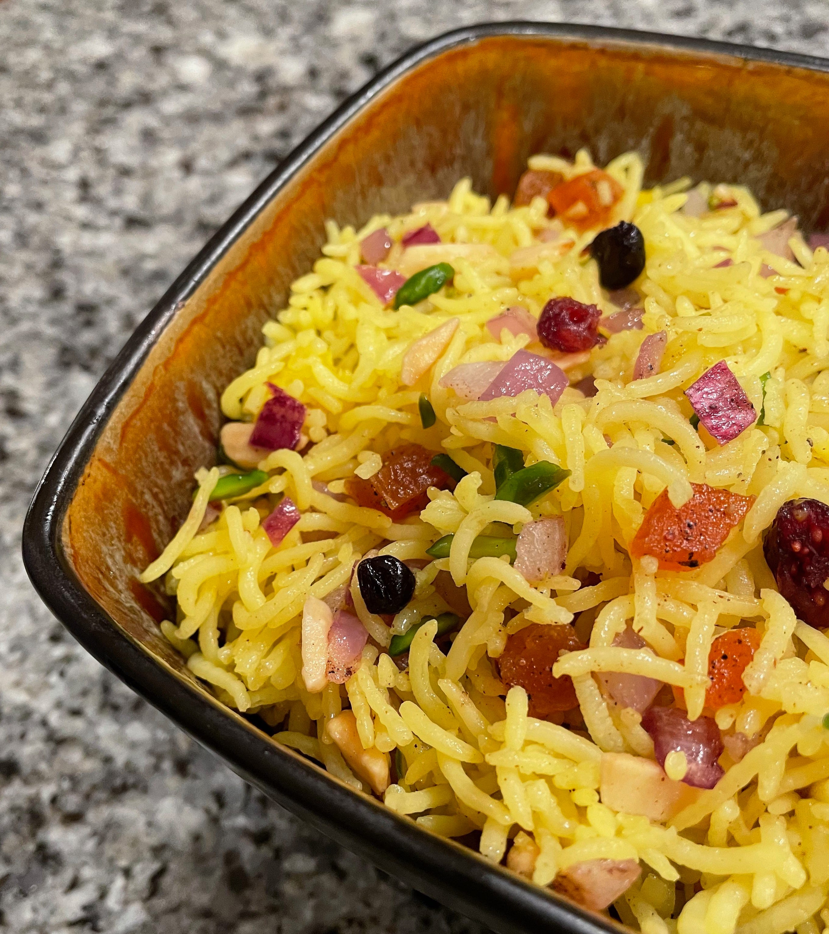 This is an easy-to-make, minimally spiced version of Persian wedding rice. For the purposes of keeping hot flashes at bay, the recipe omits the many “warm” or “hot” spices that are classically added. It also leaves out the complicated steps for a crunchy base which are time-consuming. Despite these changes, this recipe is quick, tasty, and pretty to look at. You might even want to make it to celebrate the first day of Spring on March 20th which is also Persian New Year, or Nowruz.